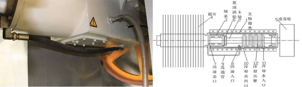 3:主軸箱采用專利技術(shù)“切石機(jī)刀具主軸冷卻結(jié)構(gòu)”,解決了切石機(jī)作業(yè)過程中主軸易發(fā)熱問題,可進(jìn)一步提升潤(rùn)滑油降溫效果,大大提高主軸箱軸承、主軸等使用壽命,降低維修成本。