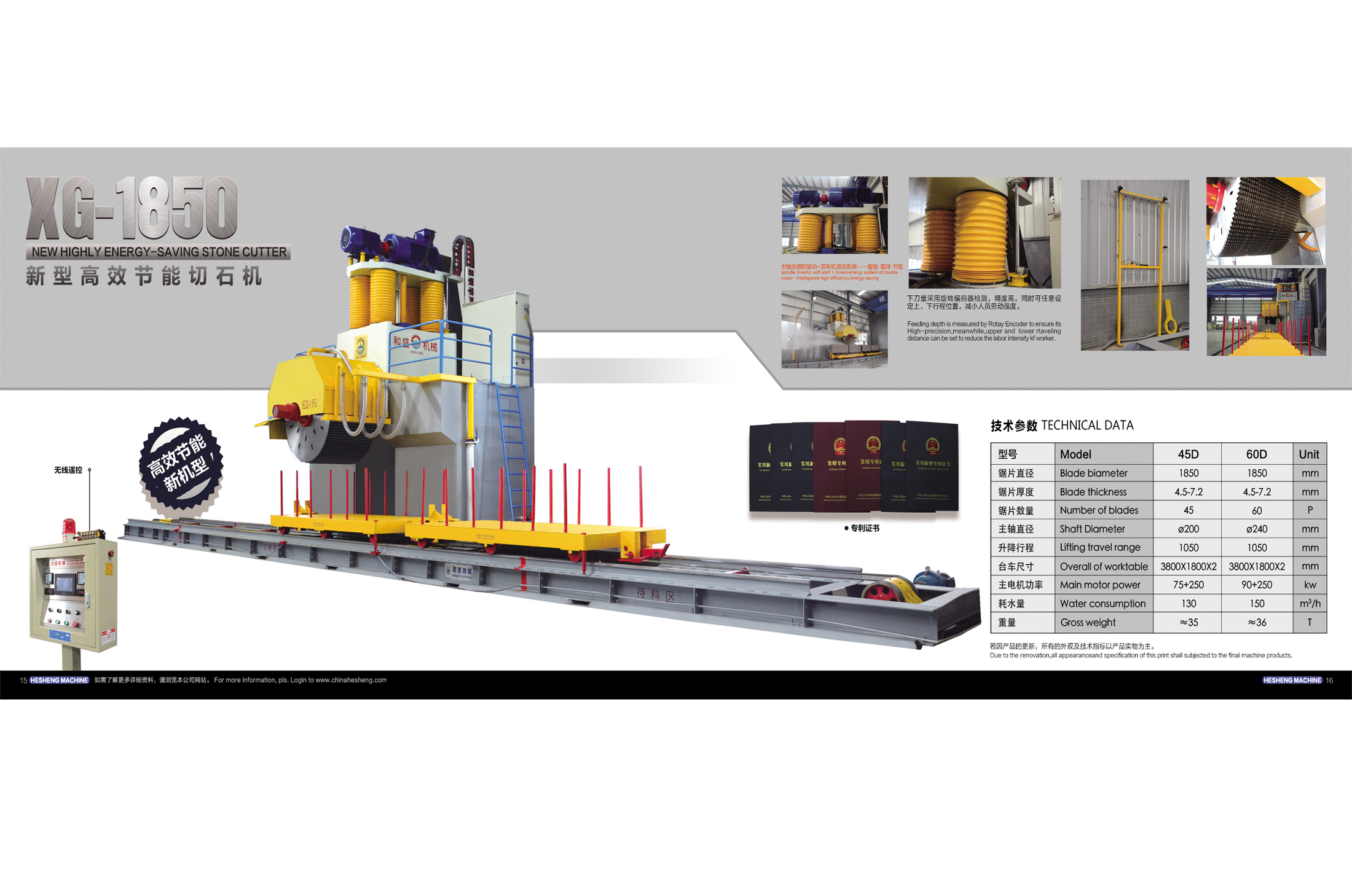 XG-1850新型高效節(jié)能切石機(jī),采用了機(jī)、電、儀、液一體化高新技術(shù)和公司6件發(fā)明專利和9件實(shí)用新型專利技術(shù),經(jīng)反復(fù)的試驗(yàn)改進(jìn),創(chuàng)新開發(fā)的新一代切石機(jī)產(chǎn)品。它具有結(jié)構(gòu)新穎、剛性好,切割效率高、切割的板材表面平整度好,生產(chǎn)成本低,節(jié)能降耗顯著、操作維修方便等特點(diǎn)。它與傳統(tǒng)的切石機(jī)相比,切割同一規(guī)格的石荒料可以多切5~8%的板材,節(jié)約石料11%,減少石粉排出40%左右,節(jié)約耗能約10~15%。